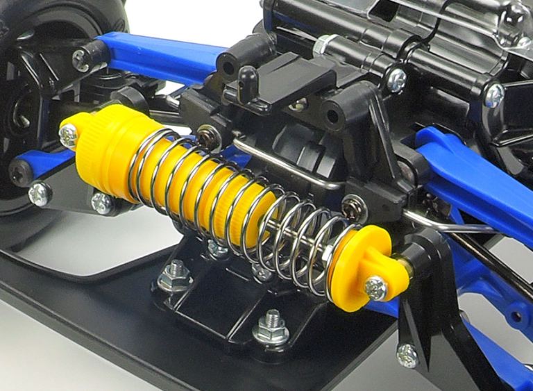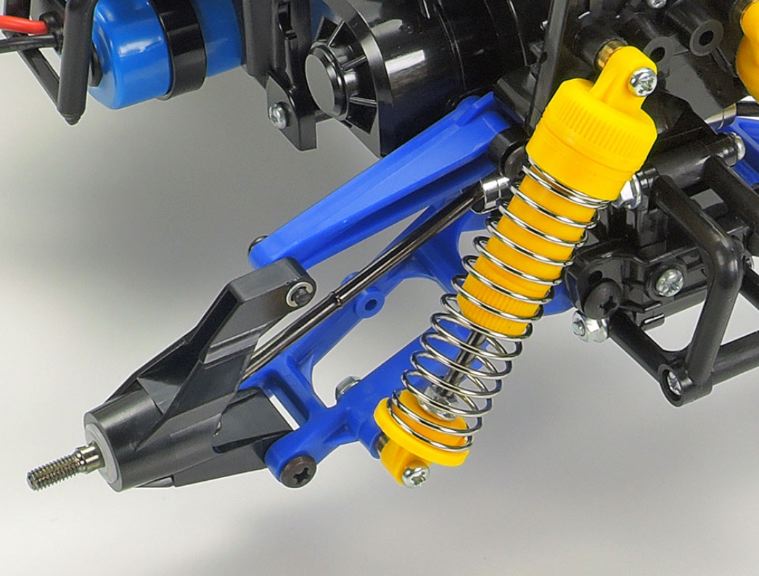 con albero motore Il telaio 4WD con motore centrale e albero cardanico si basa su una monoscocca leggera e resistente, con sospensioni a doppio braccio oscillante indipendenti a 4 ruote fissate ai cambi: un layout di facile manutenzione utilizzando i bracci I superiore e H inferiore . I doppi ammortizzatori ad olio CVA nella parte posteriore e uno singolo nella configurazione del mono ammortizzatore anteriore sono uniti da uno stabilizzatore anteriore per un flex ottimale. Le unità differenziali dell’ingranaggio anteriore e posteriore sono in scatole del cambio sigillate e un supporto motore in alluminio migliora ulteriormente l’affidabilità.