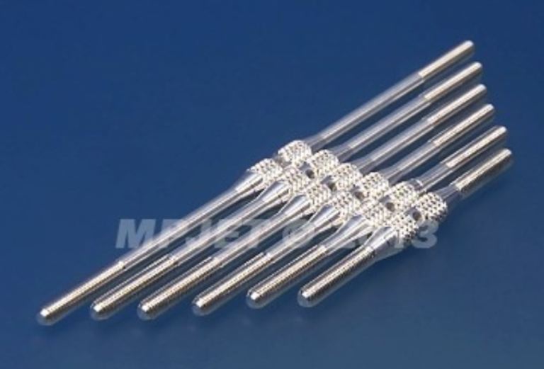 Tiranti regolabili con terminali a vite, zigrinato, realizzato in lega di alluminio. Filettatura a destra e a sinistra M3, lunghezza totale di 70 mm.