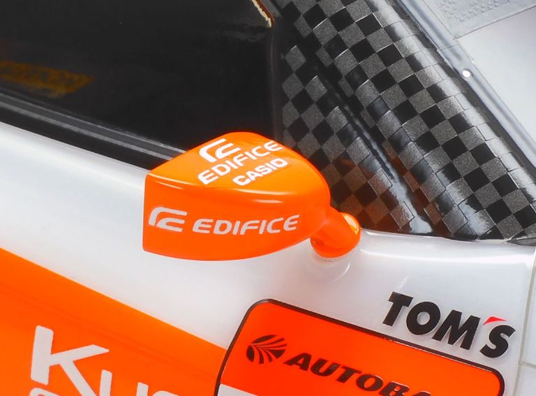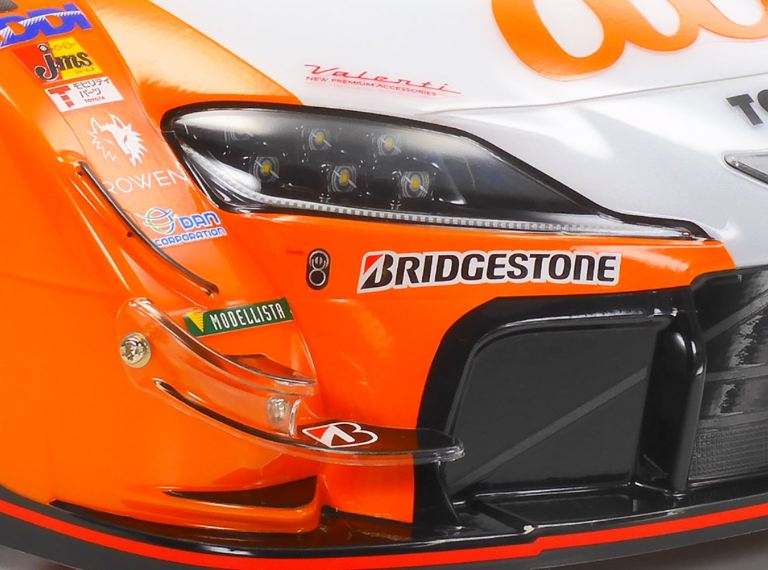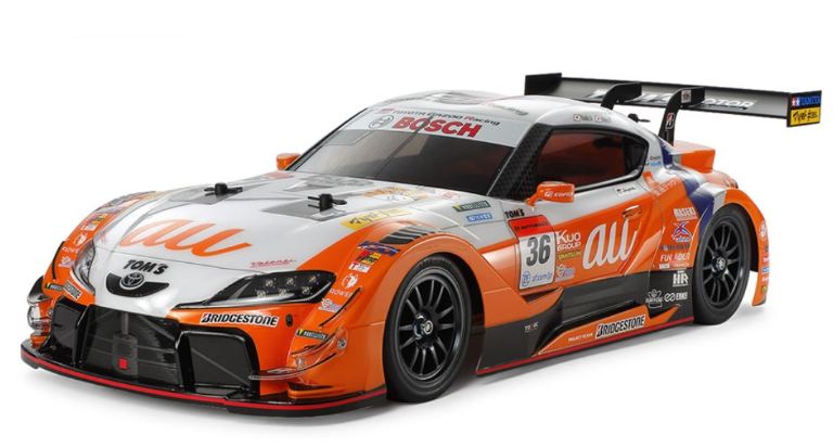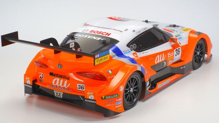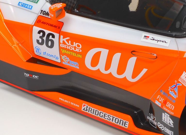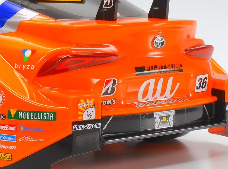 • La forma potente della GR Supra GT500 è riprodotta con stile da una carrozzeria in policarbonato rigido e leggero (trasparente) con parabole per le luci anteriori in policarbonato stampate separatamente (i LED non sono collegabili. La livrea “au” è fedelmente riprodotta.
