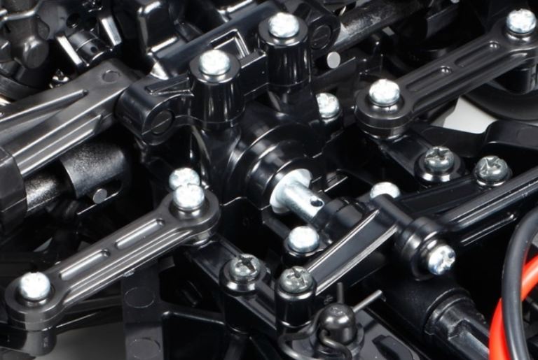 • Il modello utilizza il telaio 4WD TT-02 a trazione cardanica che offre adattabilità e stabilità elevate.