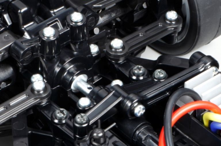 • Il kit utilizza il telaio 4WD TT-02 a trasmissione cardanica che offre grande adattabilità con vari tipi di allestimenti.