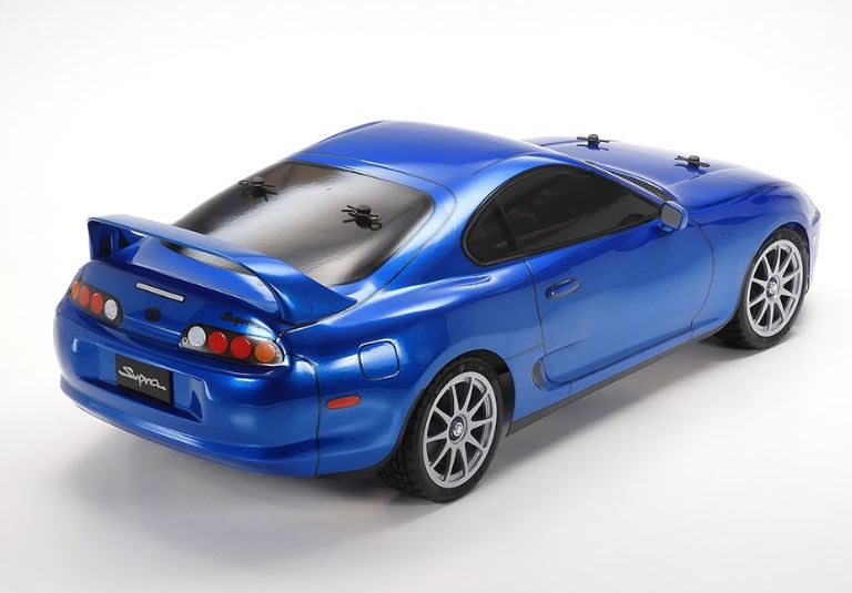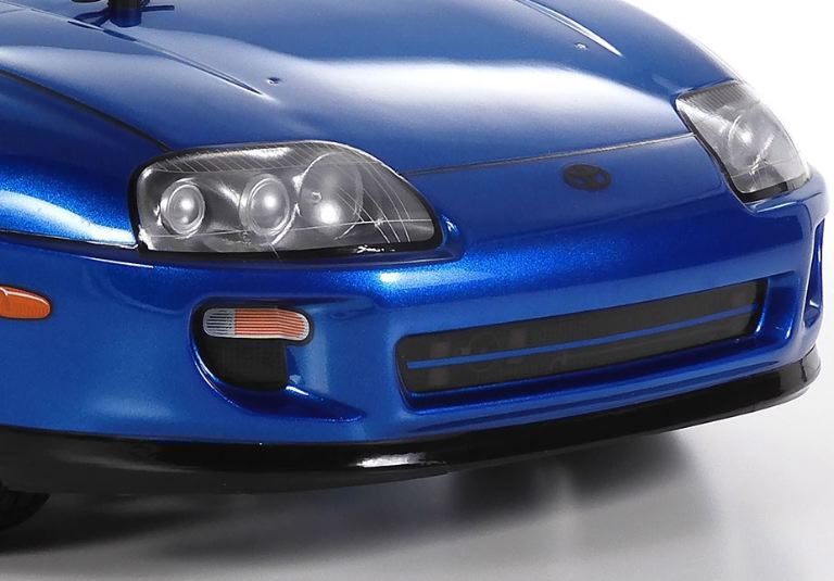 Toyota Supra (JZA80) (BT-01) con il carrozzeria in policarbonato preverniciato in blu metallizzato (PS-16), passaruota pretagliati e fori di montaggio sulla carrozzeria prefabbricati, ottima non solo per i principianti ma anche per i veterani dellR/C.