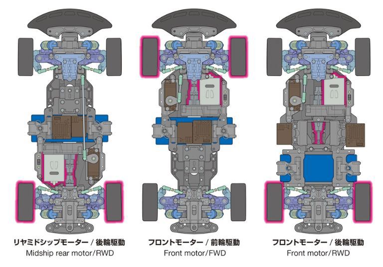 Il telaio 2WD BT-01 offre la possibilità di scegliere tra due tipi di passo e sistema di trazione anteriore o posteriore. Senza rimuovere la batteria, il motore e le configurazioni dellapparecchiatura R/C dal telaio centrale, è sufficiente cambiarle direzioni di attacco degli ingranaggi finali e tiranteria dello sterzo per passare dalla trazione anteriore a quella posteriore anteriore (FR) oppure è possibile scegliere la posizione del motore posteriore al centro (MR) per le auto a trazione posteriore.