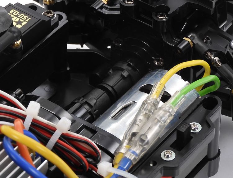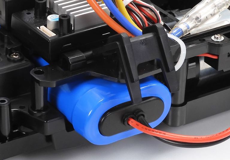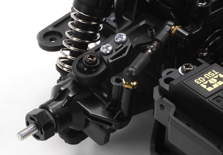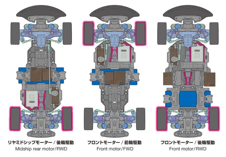 Senza rimuovere la batteria, il motore e le configurazioni dellimpianto RC dal telaio centrale, è sufficiente cambiarle direzioni di attacco degli ingranaggi finali e tiranteria dello sterzo per passare dalla trazione anteriore a quella posteriore Per le auto a trazione posteriore è possibile scegliere la posizione del motore anteriore (FR) o posteriore al centro (MR). (Sei configurazioni sono disponibile in totale.)