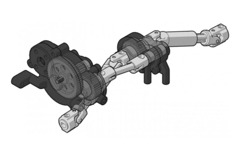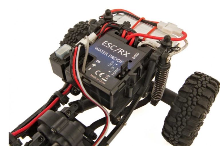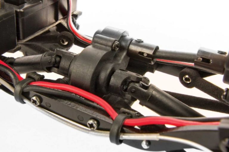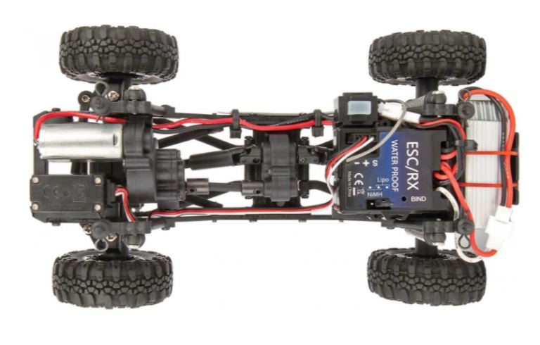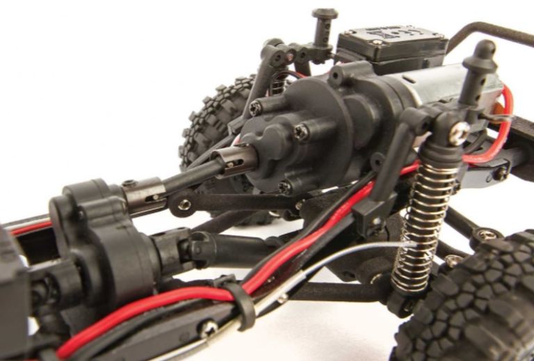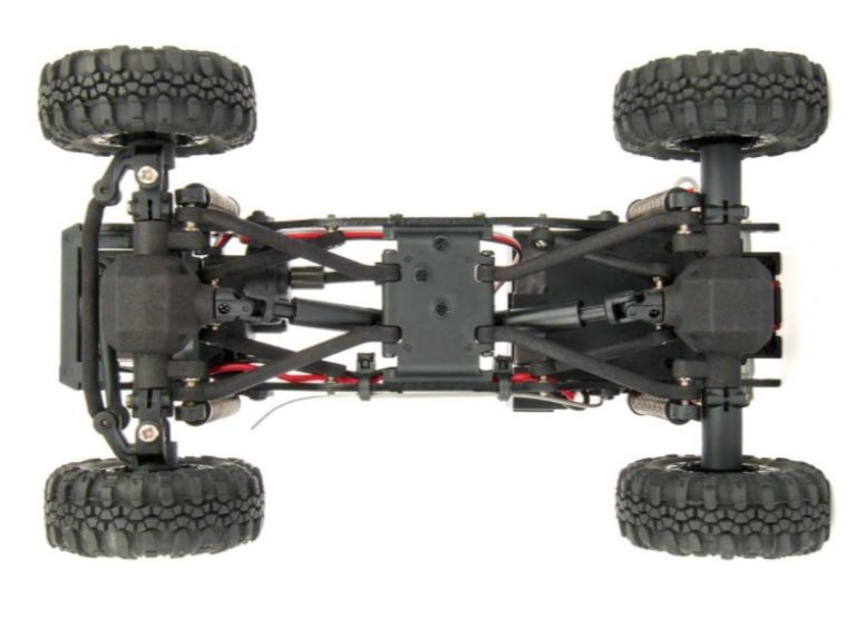 Motore montato in avanti e cassa di trasferimento divorziata: il motore montato in avanti mette la parte più pesante del rig sopra le gomme anteriori. Questo peso in avanti mantiene le gomme anteriori a terra e fornisce una migliore presa anteriore durante le salite. Il caso di trasferimento divorziato fornisce un baricentro più basso in uno spazio compatto. Non solo questa combinazione si comporta bene, ma aggiunge anche realismo in scala, consentendo molto spazio se si desidera aggiungere un carrozzeria o interni personalizzati.