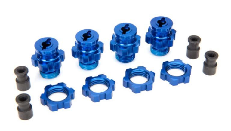 Mozzi ruota, scanalati, 17 mm, corti (anodizzati blu) (4) / dadi ruota, scanalati, 17 mm (anodizzati blu) (4) / fermo mozzo M4 X 0.7 (4) / perno assale (4) (Slash 4WD)