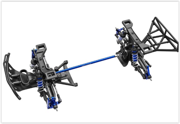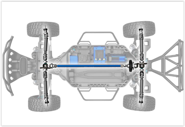 Lo Slash 4X4 Ultimate utilizza solo tre ingranaggi per azionare tutte e quattro le ruote, eliminando la necessità di una trasmissione a più marce. La trasmissione altamente efficiente gira senza sforzo su cuscinetti a sfera sigillati in gomma ed è integrata perfettamente nell’esclusivo telaio a basso baricentro dello Slash 4X4 Ultimate per prestazioni ottimali e facile manutenzione. L’albero di trasmissione centrale è formato da alluminio estruso ed è estremamente leggero, contribuendo all’accelerazione immediata dello Slash 4X4 Ultimate. Non ci sono semiassi, nessuna coppetta di trasmissione che oscilla e l’albero funziona perfettamente dritto e fedele con rigidità e durata superiori.
