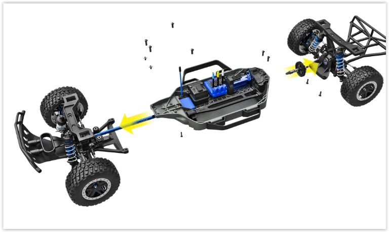 L’innovativa carrozzeria senza clips di Slash è dotato di un montaggio sicuro con una rimozione facile e veloce. Nessun montante, nessuna clip: basta far cadere la carrozzeria sul telaio e agganciarlo in posizione per una presa sicura. Quando è il momento di cambiare la batteria, premi le linguette sotto i passaruota e sollevale per accedere al telaio in pochi secondi.