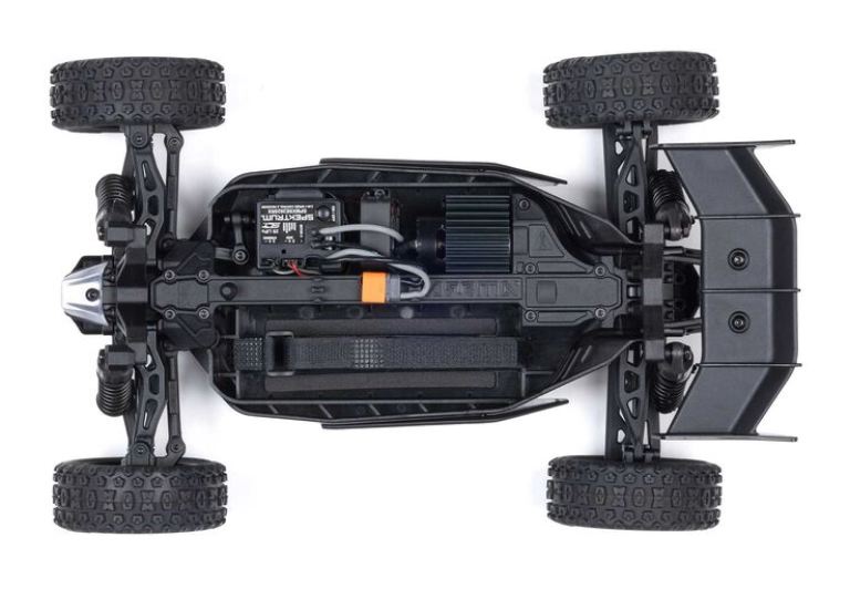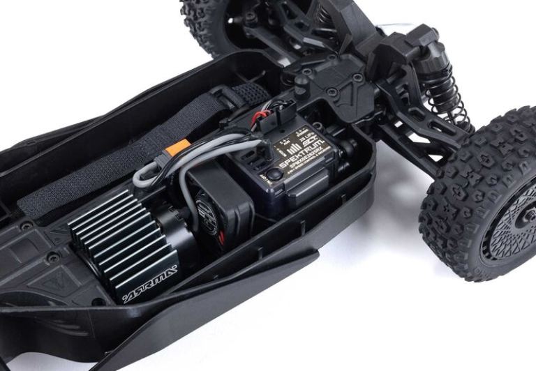 L’ARRMA TYPHON GROM sopporta le sollecitazioni a cui lo sottoponi. Il robusto telaio composito ventilato per il raffreddamento supporta una trasmissione 4WD resistente con ingranaggi metallici robusti. La potenza del motore brushless MEGA 380 viaggia attraverso la trasmissione chiusa fino a raggiungere le resistenti ruote e gomme da buggy. Ammortizzatori a olio assorbono le asperità per una guida fluida. Anche il servo dello sterzo Spektrum SX110 ha ingranaggi metallici e, come l’ESC e ricevitore Spektrum SLT 2 in 1 da 25 A dotato di connettore IC2, è impermeabile per un bashing spensierato in qualsiasi condizione. Una ventola di raffreddamento ad alta velocità integrata mantiene basse le temperature del motore e dell’ESC per una lunga durata di prestazioni massime.