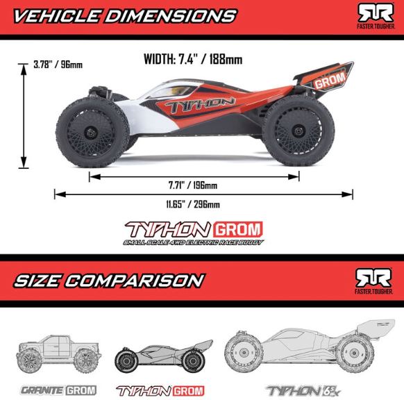 ARRMA porta le prestazioni dei buggy RC di piccole dimensioni a un livello completamente nuovo con il TYPHON GROM RTR veloce, resistente e conveniente. Agile e reattivo come l’originale in scala 1/8, il piccolo TYPHON GROM offre un’elevata dose di prestazioni e durata ARRMA genuine. Ma è abbastanza piccolo da poter essere portato quasi ovunque per sessioni di bashing ARRMA adrenaliniche ogni volta che ne hai voglia.