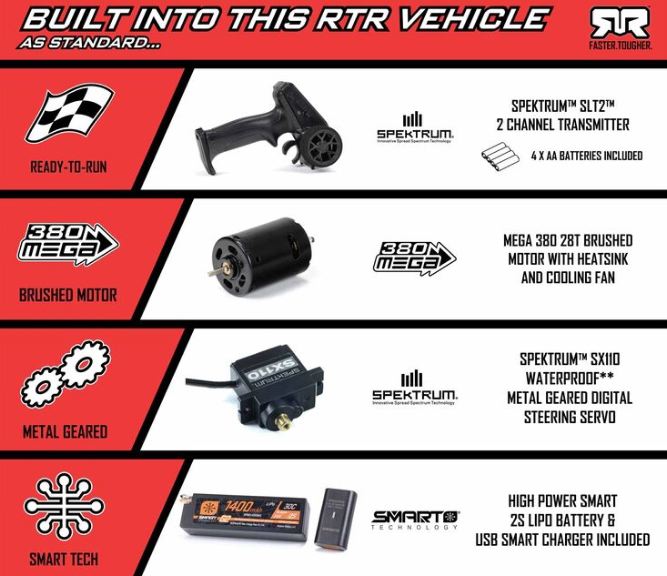 Se sei un principiante del bashing RC, il trasmettitore Spektrum 2,4 GHz SLT2 ti aiuta ad apprendere le abilità di controllo in modo sicuro limitando la velocità massima al 50% o al 75% fino a quando non sarai pronto a gestirla completamente. Anche la ricarica della batteria Spektrum Smart 2S LiPo inclusa è senza pensieri. Basta collegarla al caricabatterie Spektrum S10 Smart G2 Mini 2S USB-C in dotazione con il connettore IC2 collegato. La tecnologia intelligente si occuperà del resto. In circa un’ora, la batteria verrà ricaricata in modo sicuro e pronta per un altro giro di divertimento.