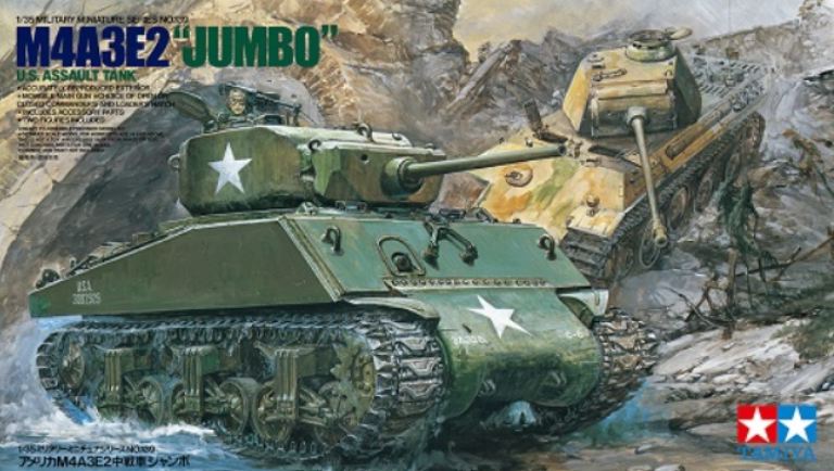 Kit di montaggio in scala 1/35 dellUS M4 Sherman M4A3E2. LM4A3E2 era una variante di carro armato dassalto sviluppata nel 1944 per fornire supporto ravvicinato alla fanteria ed era anche noto come Jumbo per via della sua pesante armatura.
