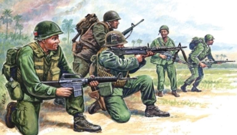 Alla vigilia dell’offensiva del Tet, nel gennnaio del 1968, le forze armate americane avevano in Vietnam più di 330.000 soldati e più di 78.000 Marines. Le unità dei Marines e la 1.ma Divisione di Cavalleria erano composte di soldati preparati, affidabili e disposti a compiere il loro dovere. Il kit rappresenta la tipica formazione di un’unità di fanteria americana. I soldati sono armati con il fucile d’assalto M16 e con la mitragliatrice di reparto M 60 da 7,62 mm. Durante la Guerra del Vietnam vennero impiegate , inoltre, unità delle forze speciali meglio conosciuti con il nome di green berets, berretti verdi.